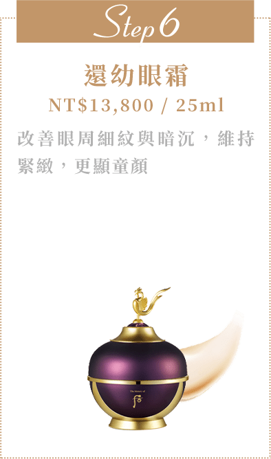 蘊含70多種珍稀宮廷韓方,佐以獨家研發「眼輪補心精萃」配方,有效使眼周肌膚平滑緊緻,重返青春。